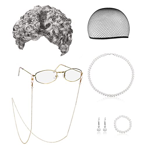 Specification: Oma Pruik grijs Old Lady kostuum grootmoeder cosplay accessoires set accessoires met krullen oma pruik, Madea oma bril, brillenketting koordriem, parelsieraden oma-bekleding