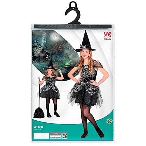 Widmann – Kinderkostuum heks, 2-delig, jurk en hoed, zwart-zilver, spinnennet, sprookjes, kostuum, verkleding, themafeest, carnaval, Halloween